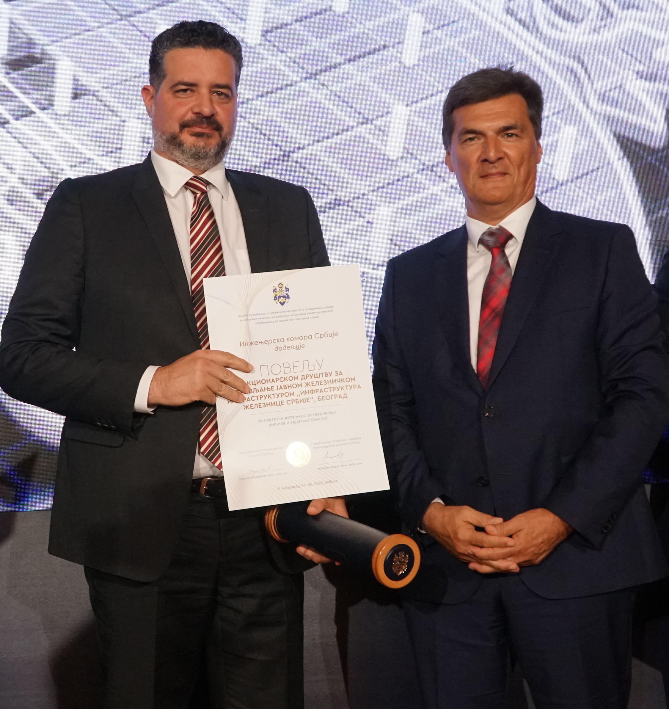 Највеће признање Инжењерске коморе Србије примио је генерални директор Инфраструктуре железнице Србије Небојша Шурлан, нa Свeчaнoj aкaдeмиjи кoja je oдржaнa 14. јуна 2023. године у Дoму гaрдe у Београду.
